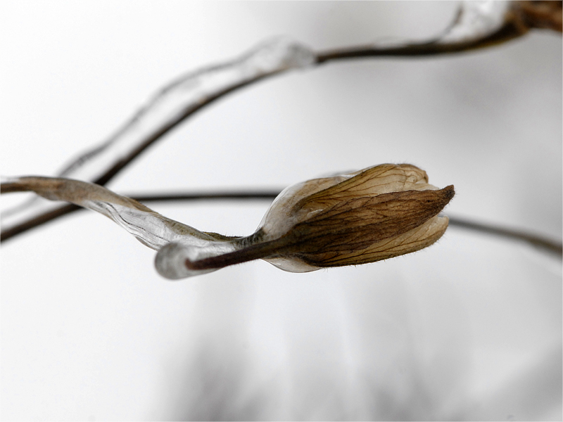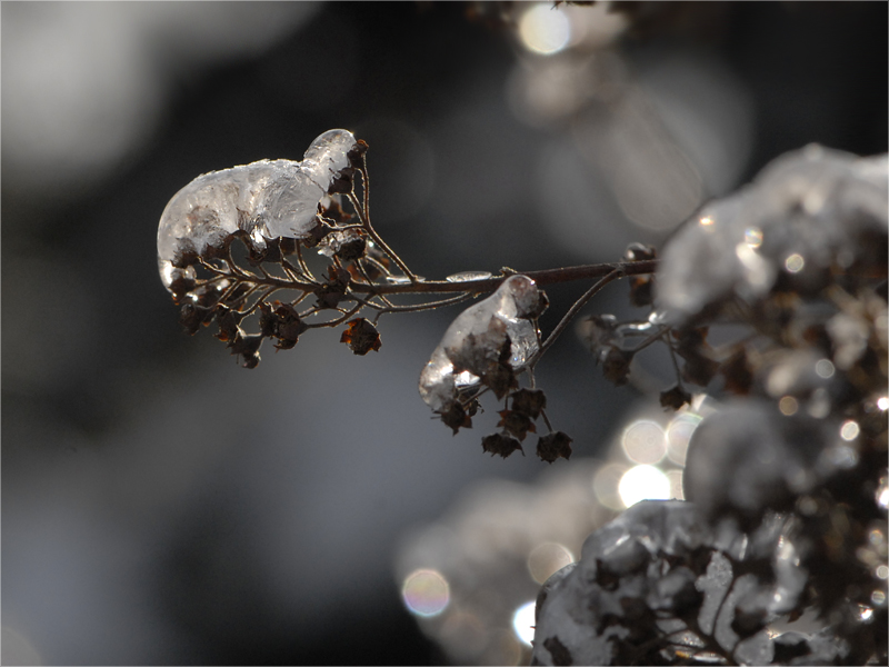 z drugiej strony... ozdobione lodem owoce berberysu, kwiaty tawuły,