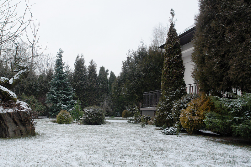 dekada stycznia pod znakiem łagodnej zimy. Ogródek przykryty śniegiem,