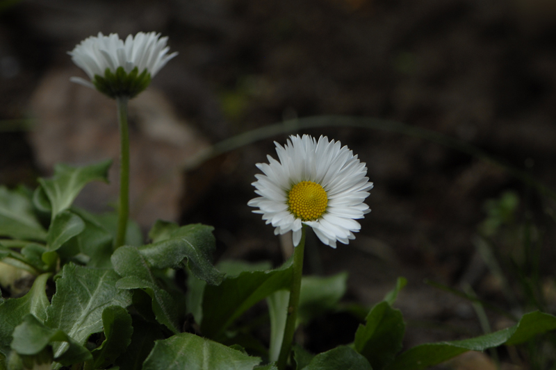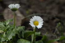ogródku kwitną stokrotki. Liście trzmieliny przybrały ciekawe